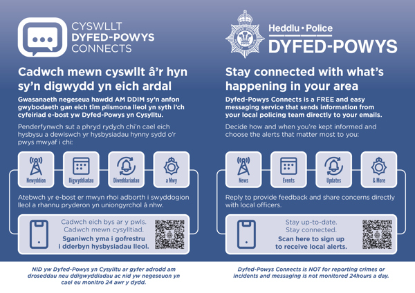 Dyfed-Powys connects is more than just a messaging platform. Landing directly into people’s inboxes, it will provide updates on local policing matters, community events, crime prevention advice and more. Users can choose what information they receive, when they receive it and can interact by replying directly to alerts, completing surveys, or sharing concerns.